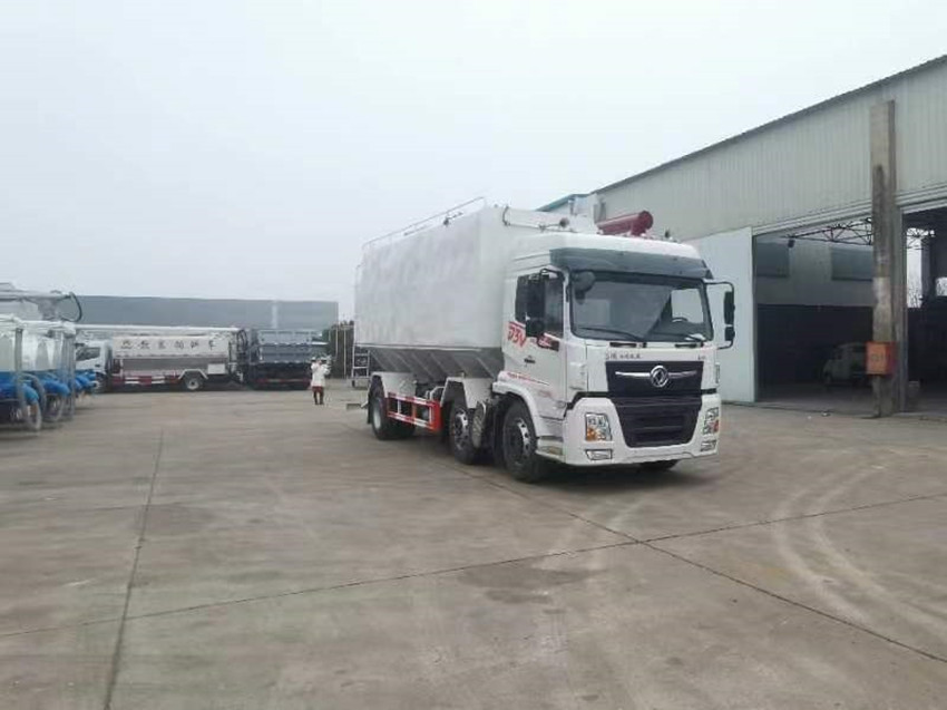 散裝飼料運輸車,散裝飼料車的飼料罐架設在卡車的底盤上,罐頂開有進料口.頂部的一根螺旋輸送卸料管(俗稱卸料絞龍)則可自由回轉和抬升,抬升的仰角可達60度。運輸時,頂部的螺旋管平臥在罐頂;卸料時則抬起,使管端的出料口與畜禽飼養(yǎng)場貯料罐頂部的進料門相接,駕駛室內裝有操縱裝置(操縱裝置也可裝置在罐體尾部),卸料時通過車底的動力輸出軸和減速器來驅動螺旋,以完成卸料。