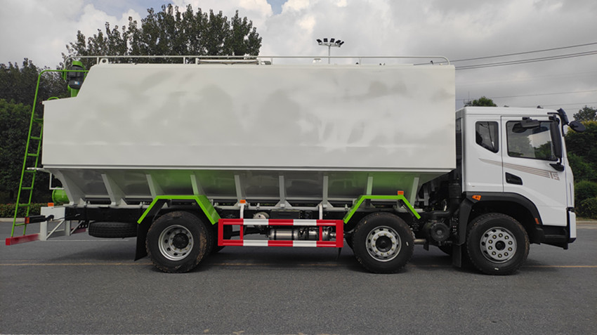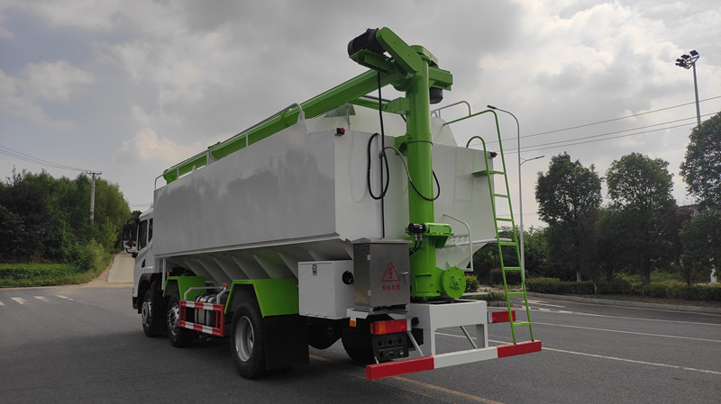 散裝飼料運輸車,散裝飼料車的飼料罐架設(shè)在卡車的底盤上,罐頂開有進料口.頂部的一根螺旋輸送卸料管(俗稱卸料絞龍)則可自由回轉(zhuǎn)和抬升,抬升的仰角可達60度。運輸時,頂部的螺旋管平臥在罐頂;卸料時則抬起,使管端的出料口與畜禽飼養(yǎng)場貯料罐頂部的進料門相接,駕駛室內(nèi)裝有操縱裝置(操縱裝置也可裝置在罐體尾部),卸料時通過車底的動力輸出軸和減速器來驅(qū)動螺旋,以完成卸料。