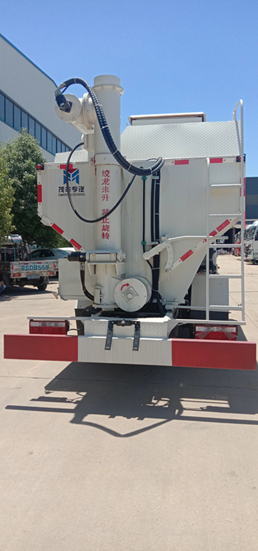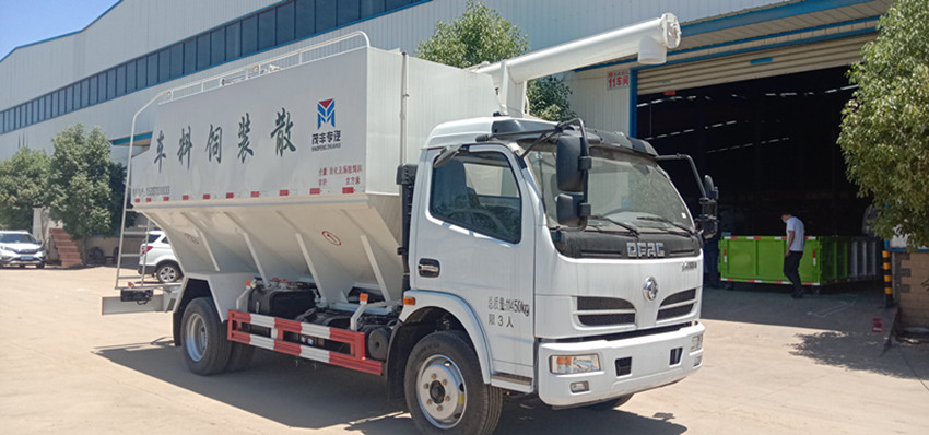 散裝飼料運輸車,散裝飼料車的飼料罐架設在卡車的底盤上,罐頂開有進料口.頂部的一根螺旋輸送卸料管(俗稱卸料絞龍)則可自由回轉和抬升,抬升的仰角可達60度。運輸時,頂部的螺旋管平臥在罐頂;卸料時則抬起,使管端的出料口與畜禽飼養(yǎng)場貯料罐頂部的進料門相接,駕駛室內(nèi)裝有操縱裝置(操縱裝置也可裝置在罐體尾部),卸料時通過車底的動力輸出軸和減速器來驅動螺旋,以完成卸料。