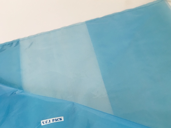 VCI氣相防銹膜(防銹袋)是將高分子聚乙烯樹(shù)脂(LDPE)與功能VCI樹(shù)脂配比混合,采用現(xiàn)代薄膜共擠技術(shù)生產(chǎn)的新一代復(fù)合防銹薄膜。具有良好的氣化防銹性能、阻隔防潮、使用方便、透明直觀等特點(diǎn);當(dāng)用塑料袋包裹金屬產(chǎn)品時(shí),氣相緩蝕劑在封閉空間內(nèi)氣化并凝聚在所有金屬表面上形成氣相保護(hù)層,從而防止金屬產(chǎn)品銹蝕。符合GB-T19532-2004防銹性能要求。